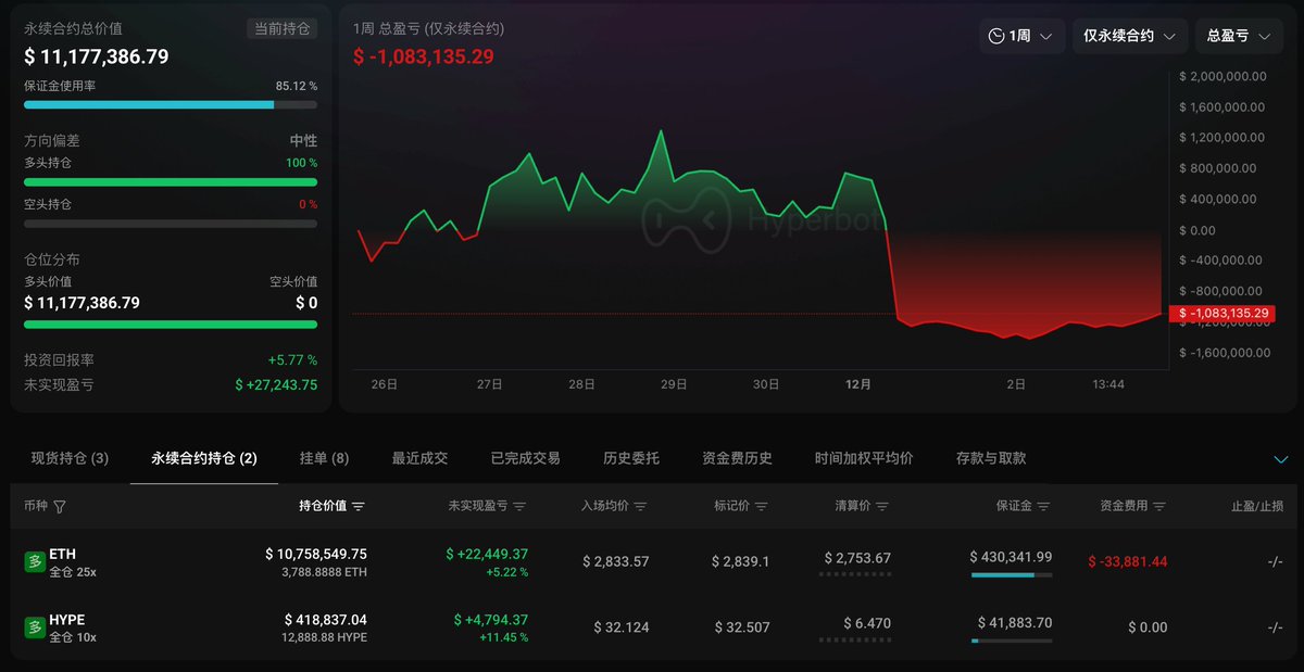 补完 25 万刀保证金后,麻吉又觉得自己可以了🤣过去 22 小时持续加仓 $ETH 多单,并在半小时前同步开启 $HYPE 仓位:目前总持仓达 1117 万美元,其中 ETH 持仓 1075 万美元,开仓价 $2,833.57,浮盈 2.5 万美元,而 HYPE 仓位仅 41.8 万美元传送门 👉