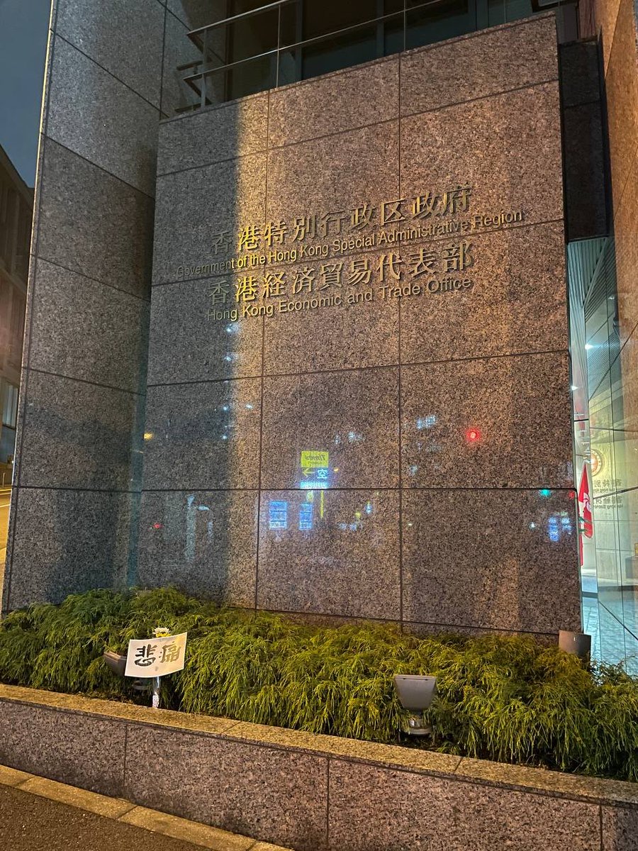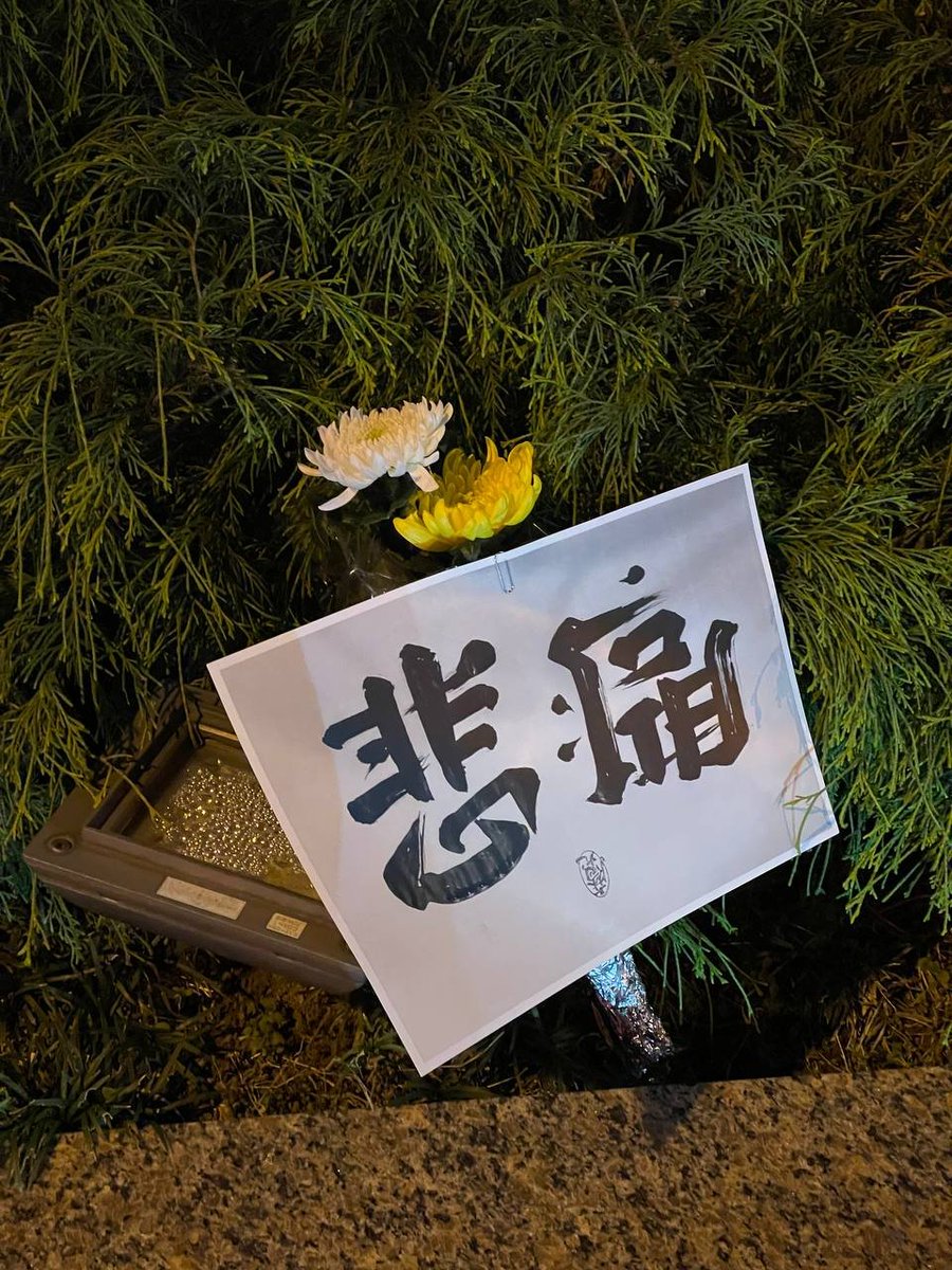 今天是香港大埔火灾遇难者头七,有华人到香港驻东京代表处献花哀悼,并留下 悲痛 / 問罪 反转字牌。