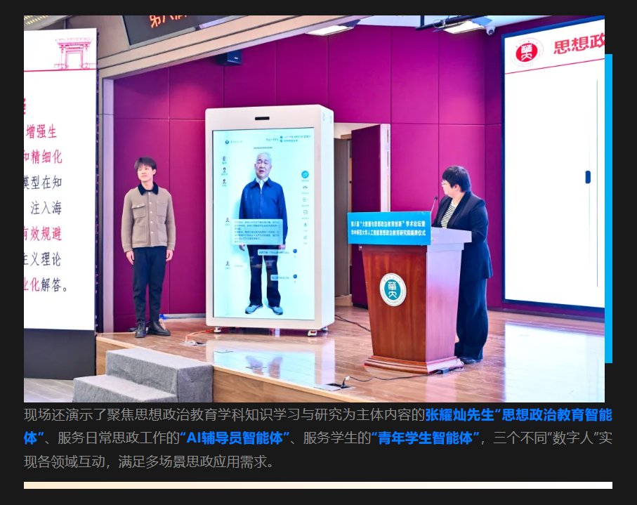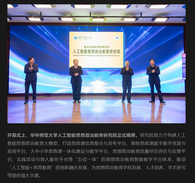 12月2日,华中师范大学宣布成立“人工智能思想政治教育研究院”,并宣布推出了“博雅思政大模型”,用于进一步强化思政教育与人工智能相结合。同时还进行了针对AI幻觉对思政教育质量的研究讲座。
