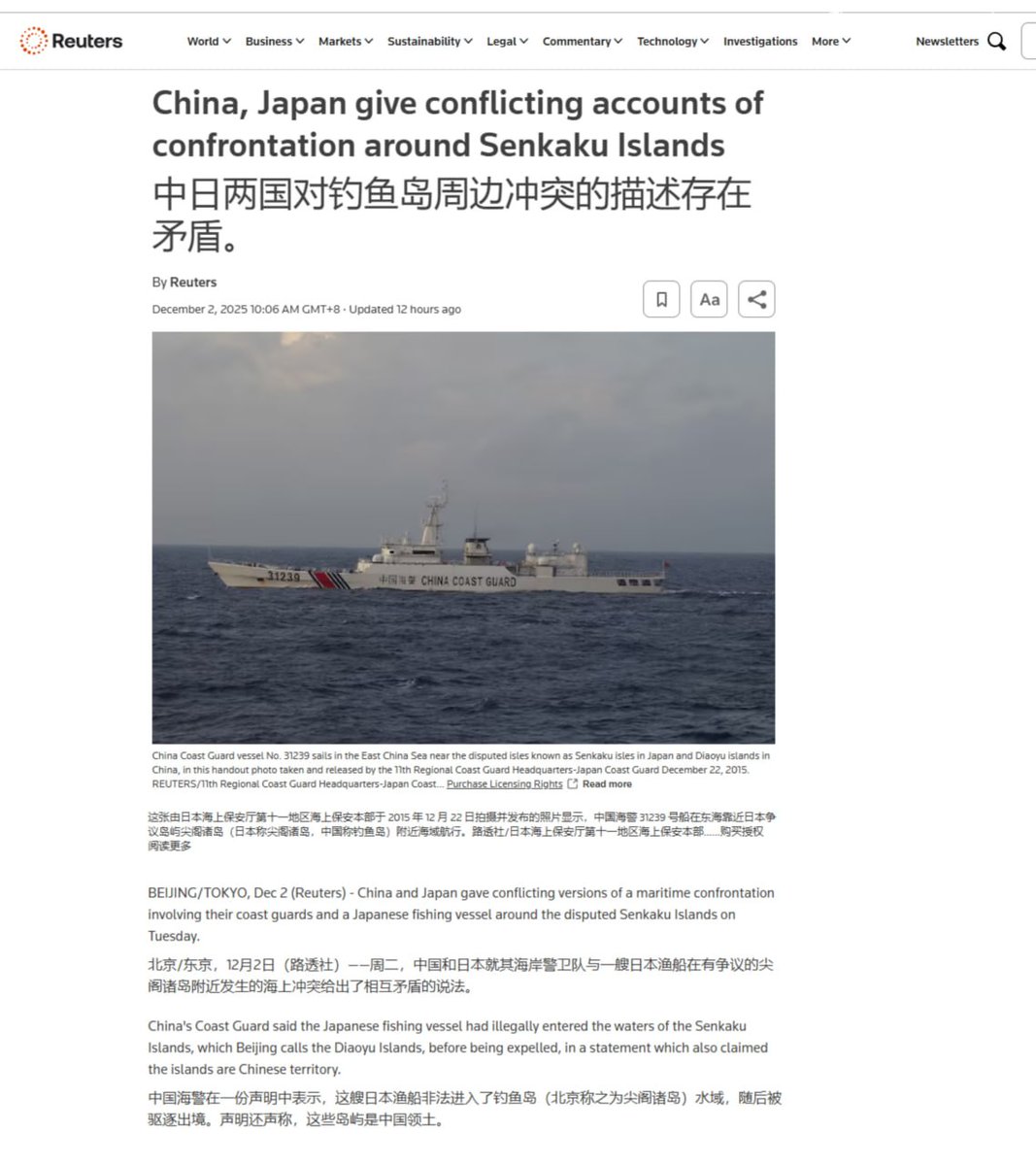 12月2日,据路透社报道,中国和日本当天分别发布了针对于钓鱼岛(日本称尖阁诸岛)附近海域发生的一起海上对峙事件的不同说法。中国海警在声明中指出,一艘日本渔船当天“非法进入”钓鱼岛领海,中国海警依法对其进行驱离,并强调钓鱼岛及其附属岛屿属于中国领土。日本方面则给出了不同版本。日本海上保