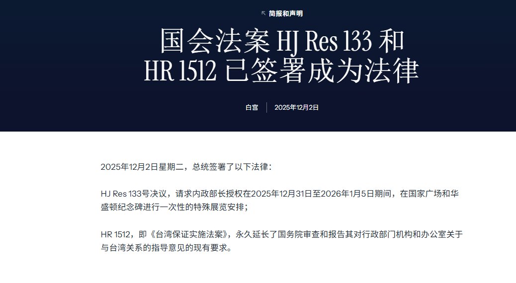 12月2日,据白宫官方消息,美国总统特朗普签署《台湾保证实施法案》将该法案正式纳入法律框架。该法案系2020年《台湾保证法案》的修正版,要求国务院每五年至少审查并更新一次对台互动指导方针,并向国会报告,确保美台官方交流更具连续性和透明度。