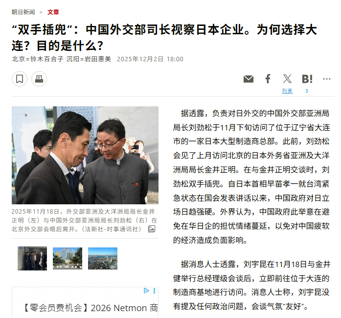 12月2日,据日本朝日新闻报道,11月底,中国外交部亚洲司司长刘劲松低调访问辽宁大连,专程前往当地一家日本大型制造企业基地视察。