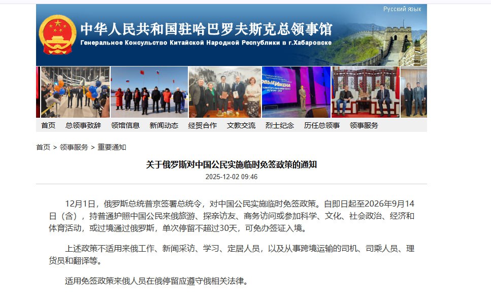 12月1日,俄罗斯总统普京签署总统令,对中国公民实施临时免签政策。自即日起至2026年9月14日(含),持普通护照中国公民来俄旅游、探亲访友、商务访问等,或过境通过俄罗斯,单次停留不超过30天,可免办签证入境。