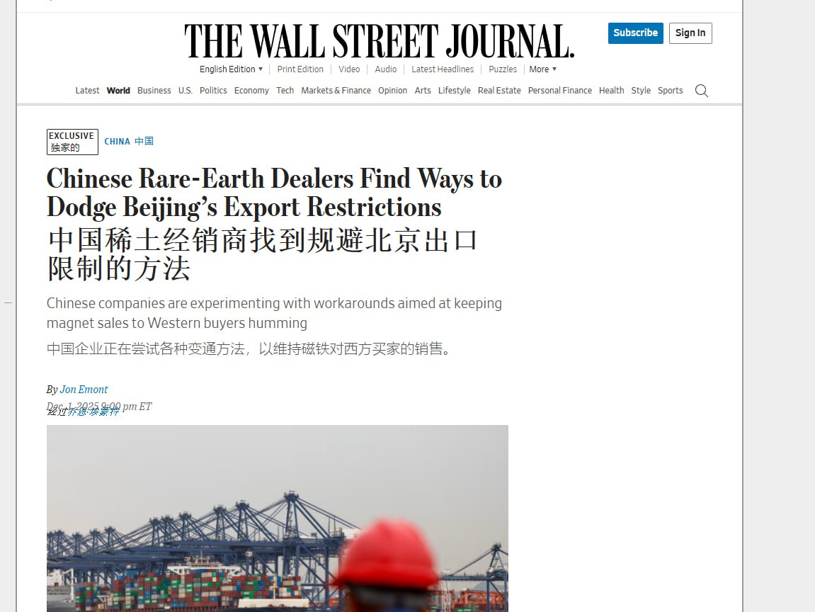 12月2日,华尔街新闻报道:随着北京加强对稀土磁体的出口管制,中国稀土磁铁企业正积极寻找合法变通方式,以维持对西方市场的供应