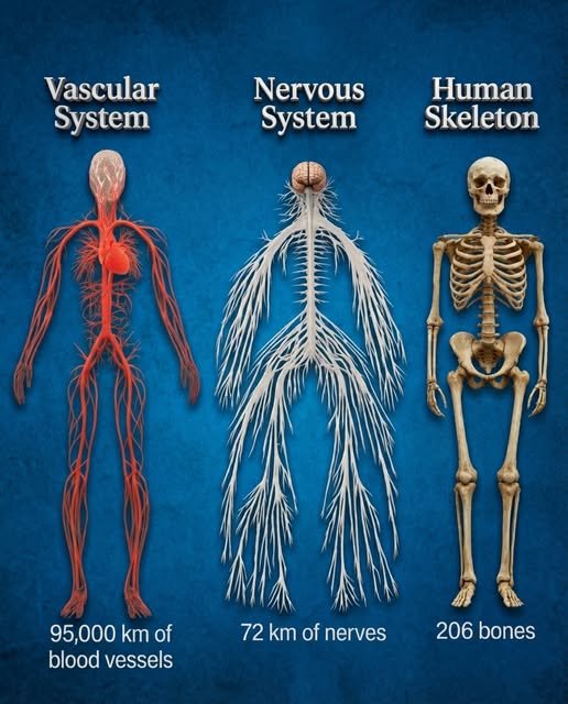 Did you know: Your body contains 72 km of nerves and enough blood vessels to circle Earth twice.[Source: Hill, M. A. (2023). The Nervous System. Anatomy & Physiology, University of Leeds; National Institutes of Health (NIH); American Heart Association]