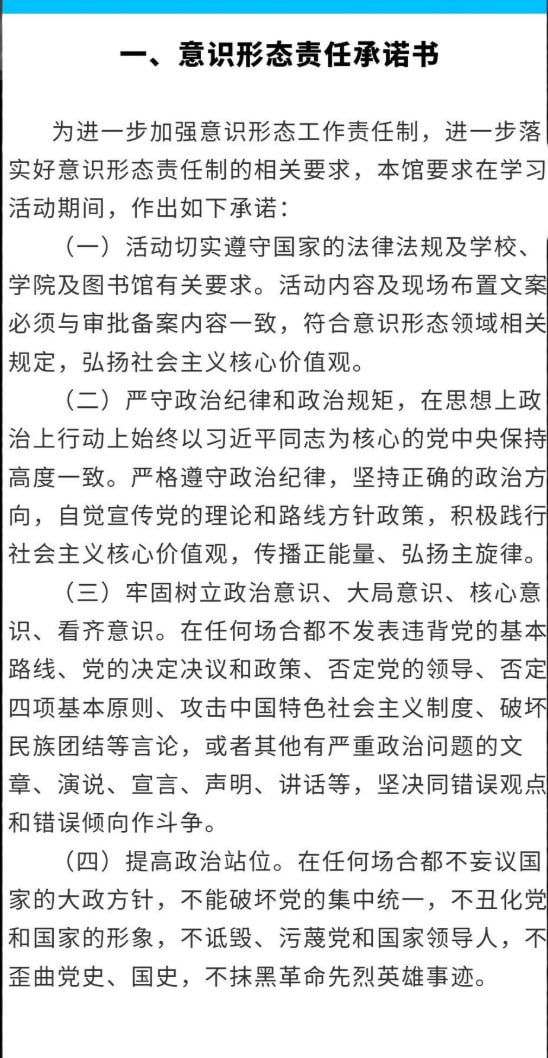 网友投稿:西安外国语大学,要预约图书馆座位,必须先签署《意识形态责任承诺书》。该承诺书要求学生“提高政治站位”,保证“在任何场合都不妄议国家大政方针”。
