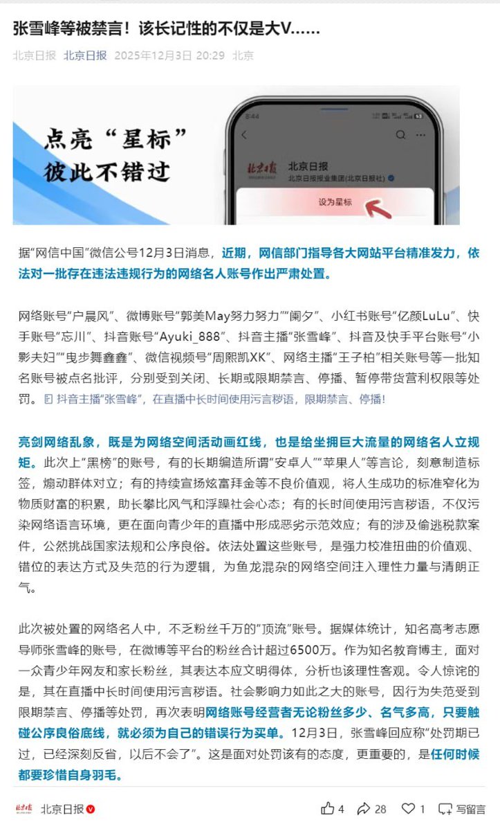 12月3日,继“网信中国”发布《网信部门依法查处网络名人账号违法违规行为》后,北京日报发文《张雪峰等被禁言!该长记性的不仅是大V……》文章称: