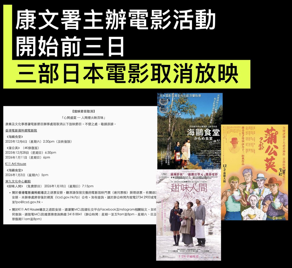 康文署电影节目办事处主办的“心间盛宴 — 人间烟火映百味”放映活动,12 月 6 日星期六开始,但在活动前三日,办事处宣布三部日本电影《海鸥食堂》、《蒲公英(4K修复版)》和《甜味人间》取消放映。