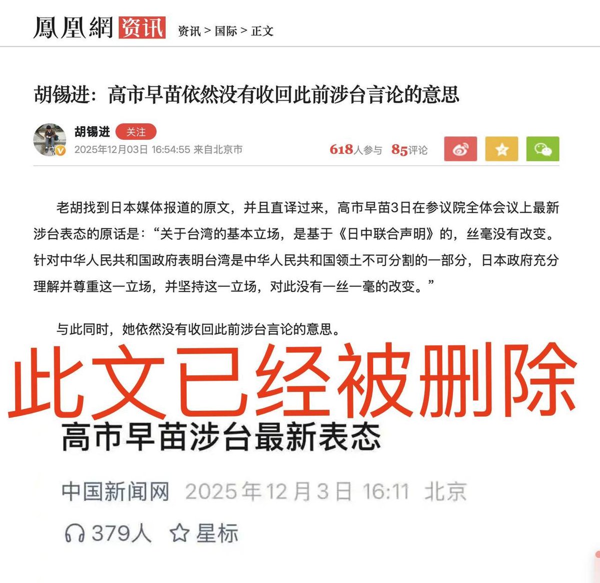 不久后,该文于昨晚悄然从凤凰网消失,搜索仅剩缓存痕迹。网友猜测或系“内部审查”或“平台自删”,类似胡锡进此前多篇涉日评论也曾“昙花一现”。胡锡进随后补发长文《高市早苗涉台表态有所软化,但更像是挤牙膏式的软化》,重申高市“尚未完整表述联合声明内容”,并酸言“相信专业机构能做出准确评估”。