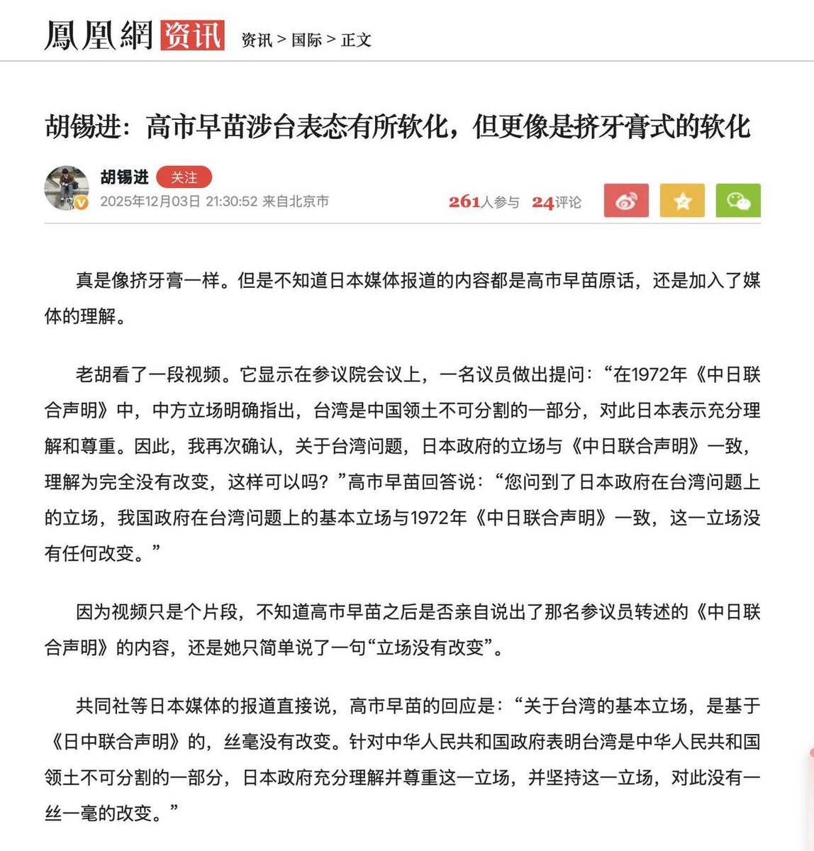 12月3日,资深媒体人胡锡进在凤凰网旗下“大风号”平台发布短文《高市早苗依然没有收回此前涉台言论的意思》,直指日本首相高市早苗在国会最新表态中虽重申基于《中日联合声明》的立场,但未明确撤回11月7日“台湾有事即日本存亡危机”的挑衅言论,意在“挤牙膏式”软化以缓解中方压力。