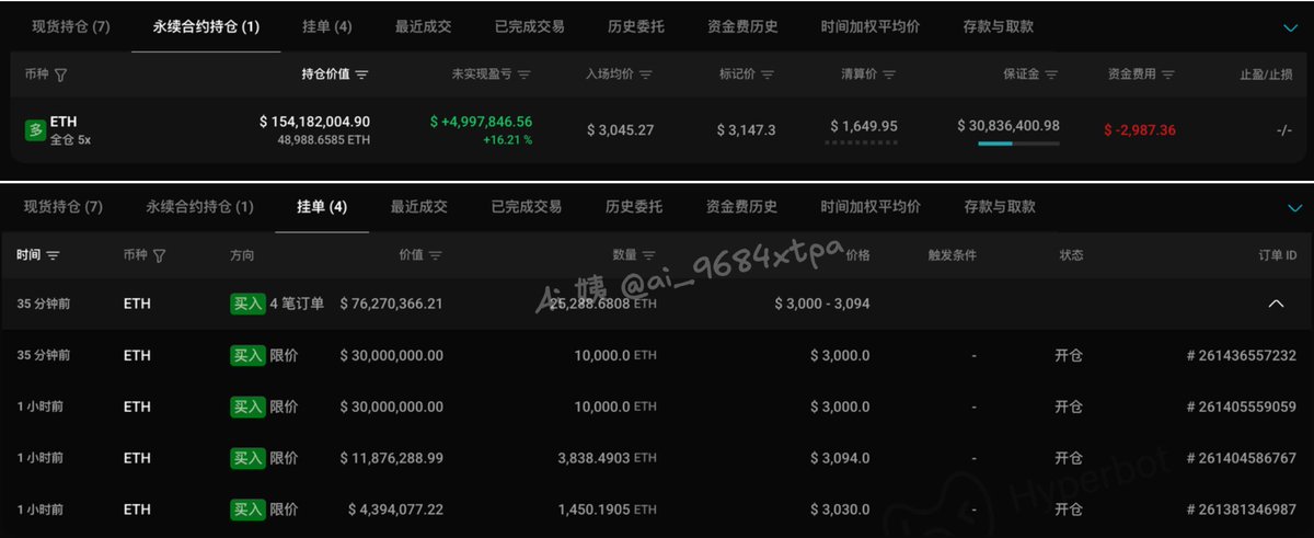 「1011 闪崩后开空内幕大佬」的 $ETH 多单规模已超 1.5 亿美元,加上挂单部分总规模超 2.3 亿美元⚡️▶︎ 持仓:48,988.65 枚,价值 1.54 亿美元,开仓价 $3,045.27,浮盈 499 万美元▶︎ 挂单:计划在 [$3,000 - $3,094] 区间买入 25,288.68 ETH,价值 7627 万美元传送门 👉