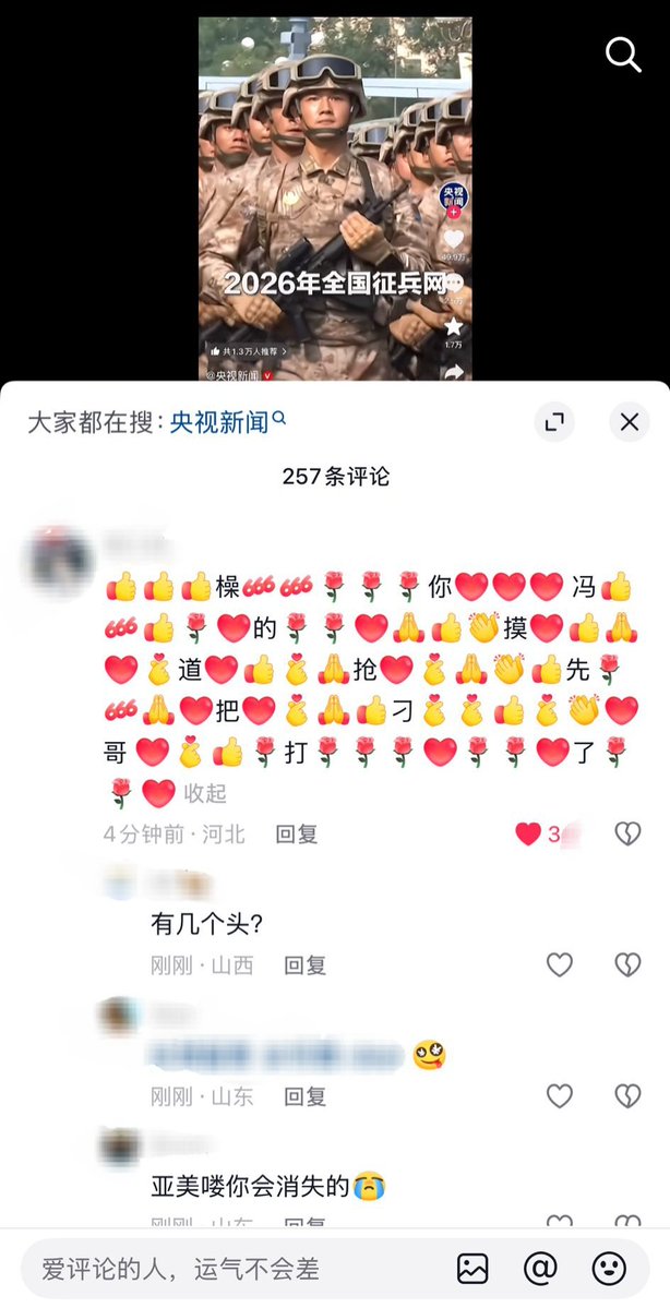 #大冲塔运动38号塔在转载央视征兵新闻的抖音评论区,有人用正能量emoji掩护用同音和形似字留言:“艹你妈的,摸到枪先把习哥打了!”,短短4分钟便获得了30多个赞👍!#大emoji运动