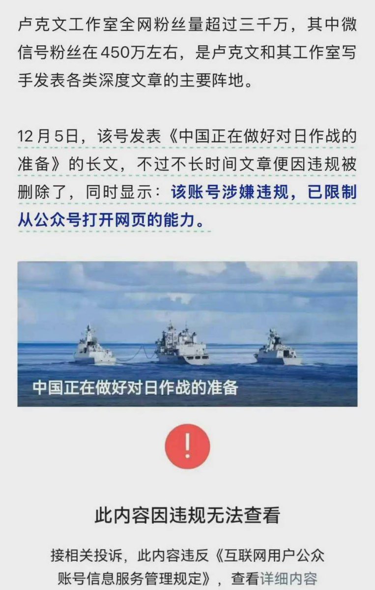 因宣传中国正在准备对日作战,著名粉蛆被封禁。12月5日,著名粉蛆“卢克文”发布文章《中国正在做好对日作战的准备》,但随后该文遭下架,12月8日,其微信公众号也随即被封禁。文章宣称,中国已在舆论、法理与军力层面展开系统性准备,并表示中俄有能力应对双线作战等。
