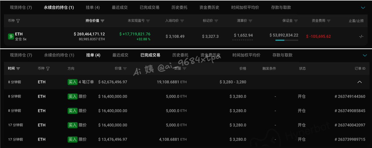 - ETH 突破 3300 美金- 内幕大佬再次向 Hyperliquid 充值 4000 万枚 USDC 保证金▶︎ 持仓:80,985.83 枚,价值 2.69 亿美元,开仓价 $3,108.49,浮盈 1772 万美元▶︎ 挂单:计划在 $3,280 买入 19,108.68 ETH,价值 6267 万美元至此,他的 ETH 多单已成为该地址 1011