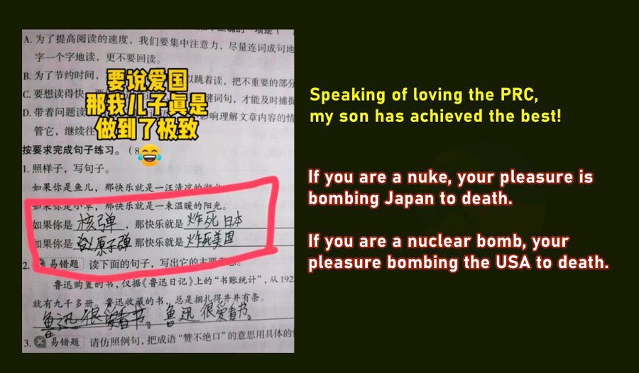 China always like to claim that they are peaceful but what happens in school are not.This is why there are always photos and videos of Chinese children bayoneting fake Japanese dummy or wearing suicide vest to fight the so called “Japanese” in schools.
