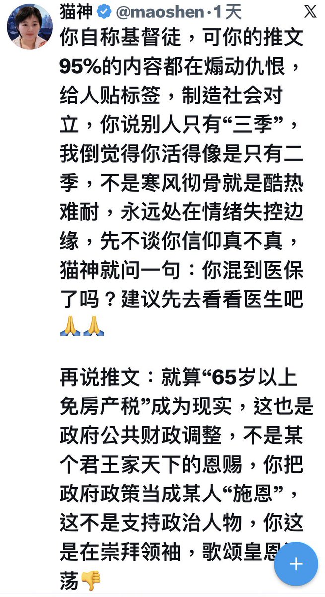 這個叫貓神的女人來罵我了! 這女人從反共博流量,突然不罵中共了。翻臉罵起法輪功來了! 再後來就是反川,現在又來罵我了。接到任務了? 這種東西,其實就是我們見慣的王志安之類中共特種部隊,中共使用網軍把它們捧紅,等它們成網紅,然後搖身一變,用真真假假的信息搞亂反共群體和社交網絡! 仔細去看看,那些黃左有幾個不是這一類? 這類人,我都懶得跟她囉嗦。拉黑了事! 貓神?貓鬼?共匪一個木馬而已!什麼東西!