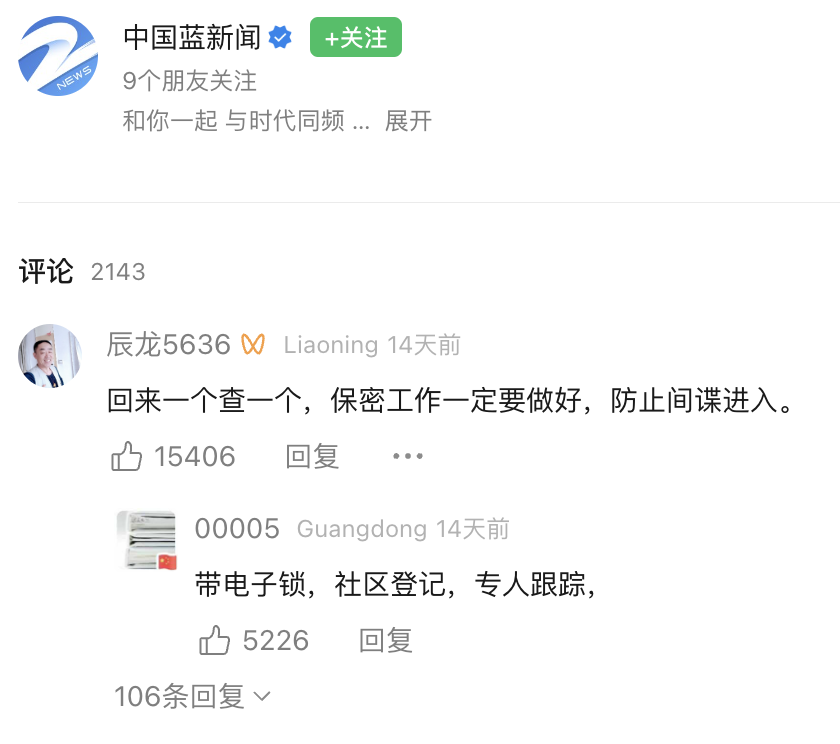 “因为爱国,海外华人抛弃舒适生活和工作纷纷回国”的宣传模式,以前的问题是没人信,现在则遭遇了另一方面的攻击。在新闻底下,眼睛血红的群众回复道:“回来一个查一个,保密工作要做好,防止间谍进入”“给这些人戴上电子锁,社区登记,专人跟踪”仅这两条就合计2万个赞。