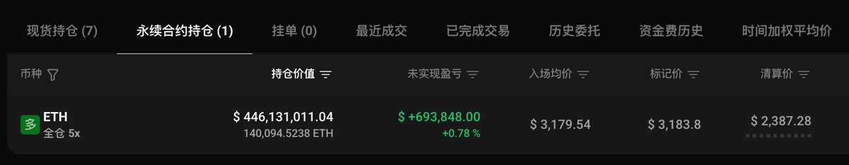 做多 14 万枚 ETH!?内幕老哥的多单持仓已超 4.46 亿美元过去半小时他再次加仓 2 万枚,最新持仓来到 140,094.52 枚,价值 4.46 亿美元,开仓价 $3,179.54,浮盈 69.3 万美元距离 1011 闪崩前的空单规模(5 亿)只差不到 5 千万了!传送门 👉