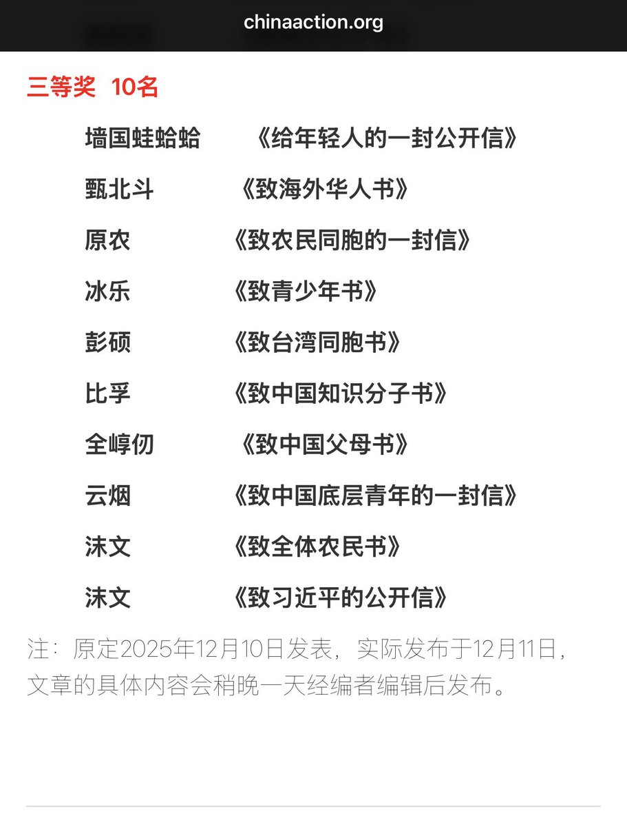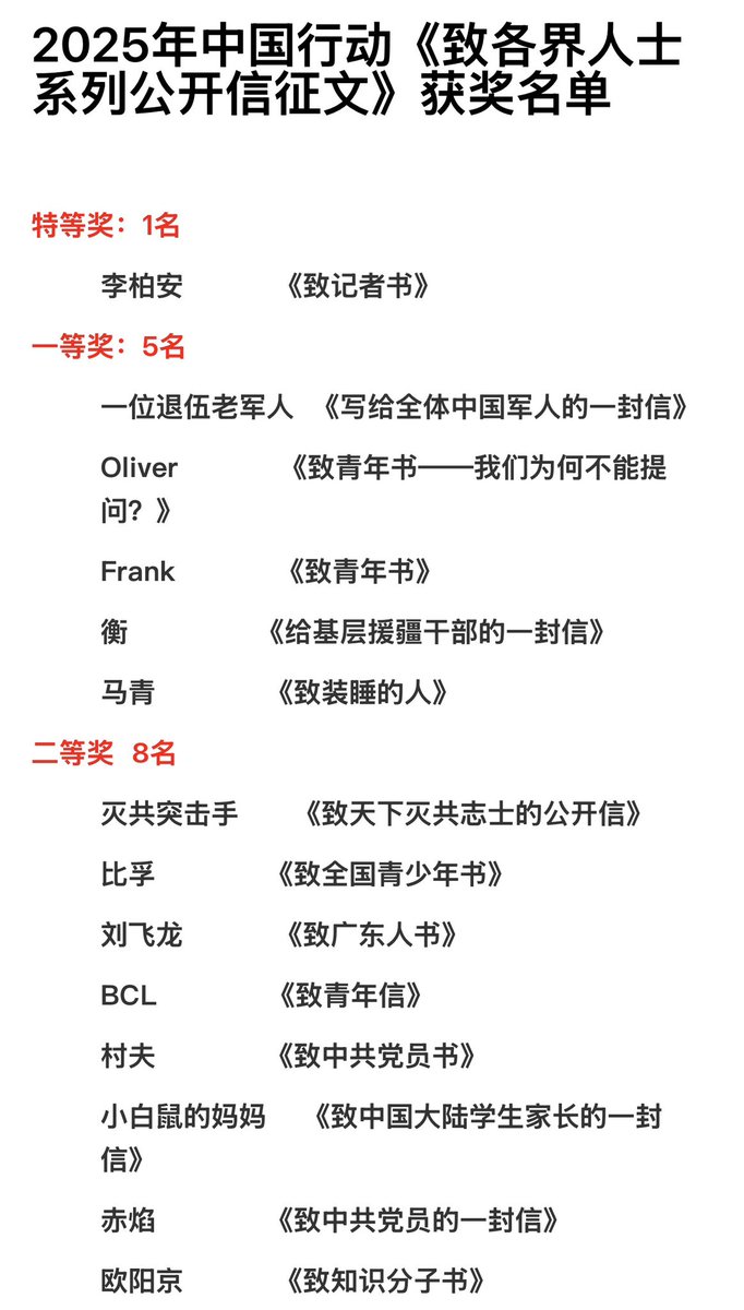 【2025年中国行动《 #致各界人士系列公开信征文 》 #获奖名单 公示】特等奖:1名李柏安《致记者书》一等奖:5名一位退伍老军人《写给全体中国军人的一封信》Oliver《致青年书—我们为何不能提问?》Frank《致青年书》衡《给基层援疆干部的一封信》马青《致装睡的人》二等奖 8名