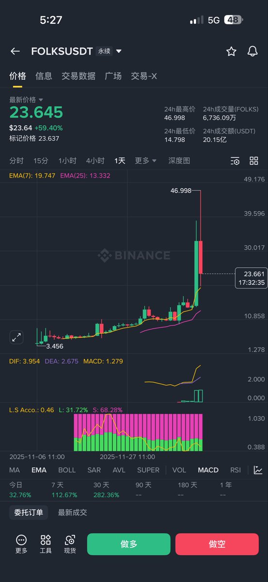 从据说币安要严打合约恶意操纵后第一个暴涨暴跌的山寨币吧?估计好多拿了币安合约壳的MM在等着看这 $Folks 能咋玩,观察管控的度在哪里。一晚上拉10倍可能是过分了,那一天涨3倍再跌个50%呢?没波动了要挨骂,波动大了也要挨骂,你们真觉得裁判好当的?🤣