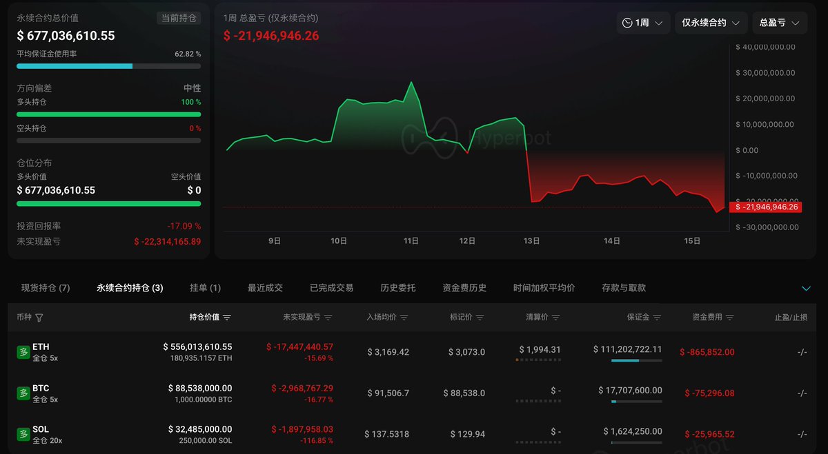 早上 $ETH 短时跌至 $3024,使得内幕大佬的 ETH 挂单继续成交📉目前整体持仓增加到了 6.77 亿美元,浮亏 2231 万美元,其中 ETH 的持仓已超 18 万枚▶︎ ETH:持仓 180,935.11 枚(5.56 亿美元),开仓价 $3,169.42,浮亏 1744 万美元▶︎ BTC:持仓 1000 枚(9032 万美元),开仓价