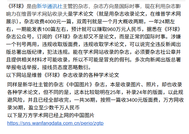 新华社旗下《环球》 《中国图片》等杂志,以收录论文为名向作者收费。据称,该杂志在维普学术数据库收录的学术论文收取费用约4000元/篇