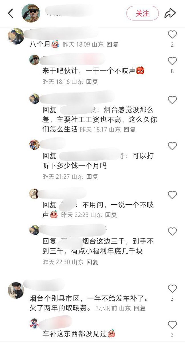 12月16日,山东烟台海信社区,一名工作人员在小红书发帖称,工资已拖欠八个月。评论区多名网友表示自己也遇到类似情况,甚至有网友透露,潍坊部分县区编外人员已有两年未发工资。