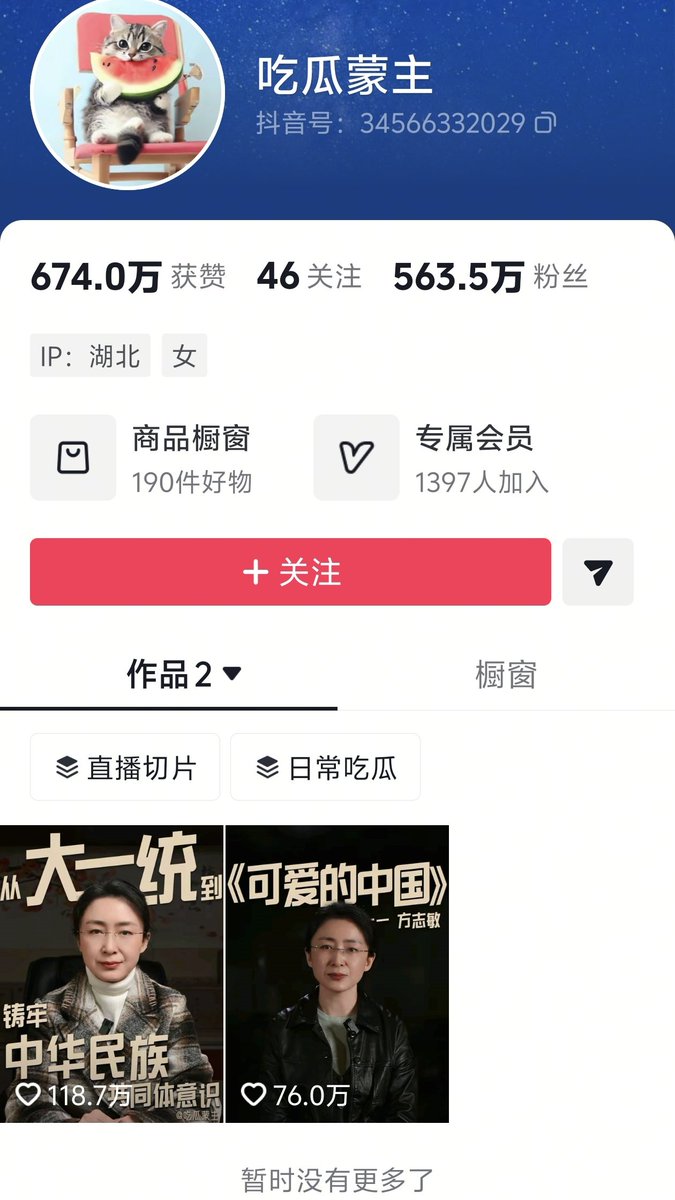 吃瓜蒙主的抖音账号只剩两个视频了,分别是“可爱的中国”和“筑牢中华民族”,哈哈,还是只有我党才能治这些牛鬼蛇神。