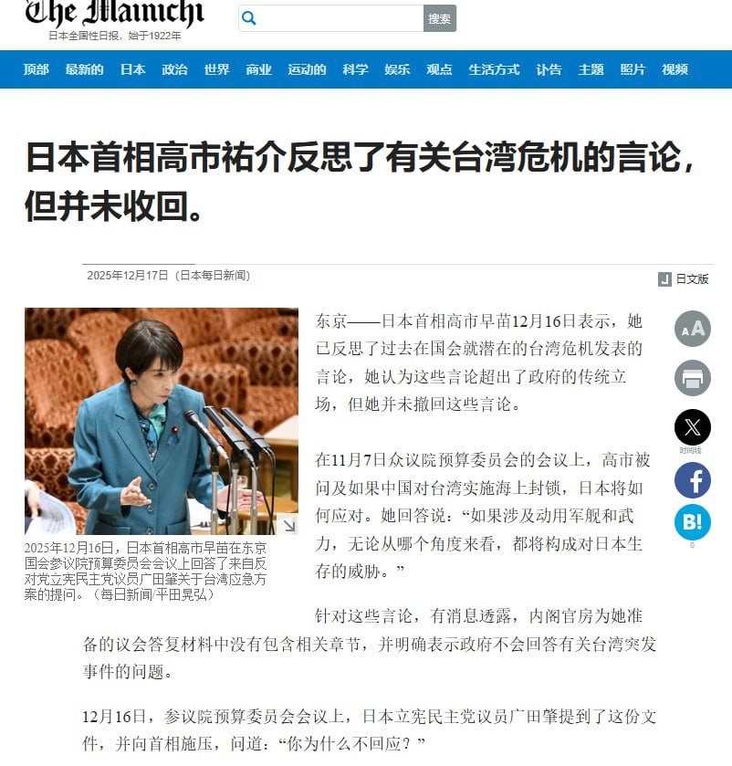12月16日,据日本每日新闻报道,日本首相高市早苗就此前在国会关于台湾潜在危机的言论作出回应,承认自己的表述超出政府传统立场,但未撤回。她强调,若中国动用武力威胁日本生存,将视情况作出应对,同时指出集体自卫权仅在“对与日本关系密切的外国发动武装攻击并威胁日本生存”时适用,除美国外其他国家符合条件可能性极低,台湾是否属于此类需视具体情况而定,并表示将反思言论以便未来在国会谨言慎行。