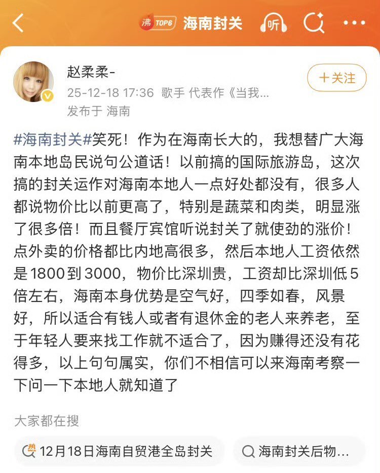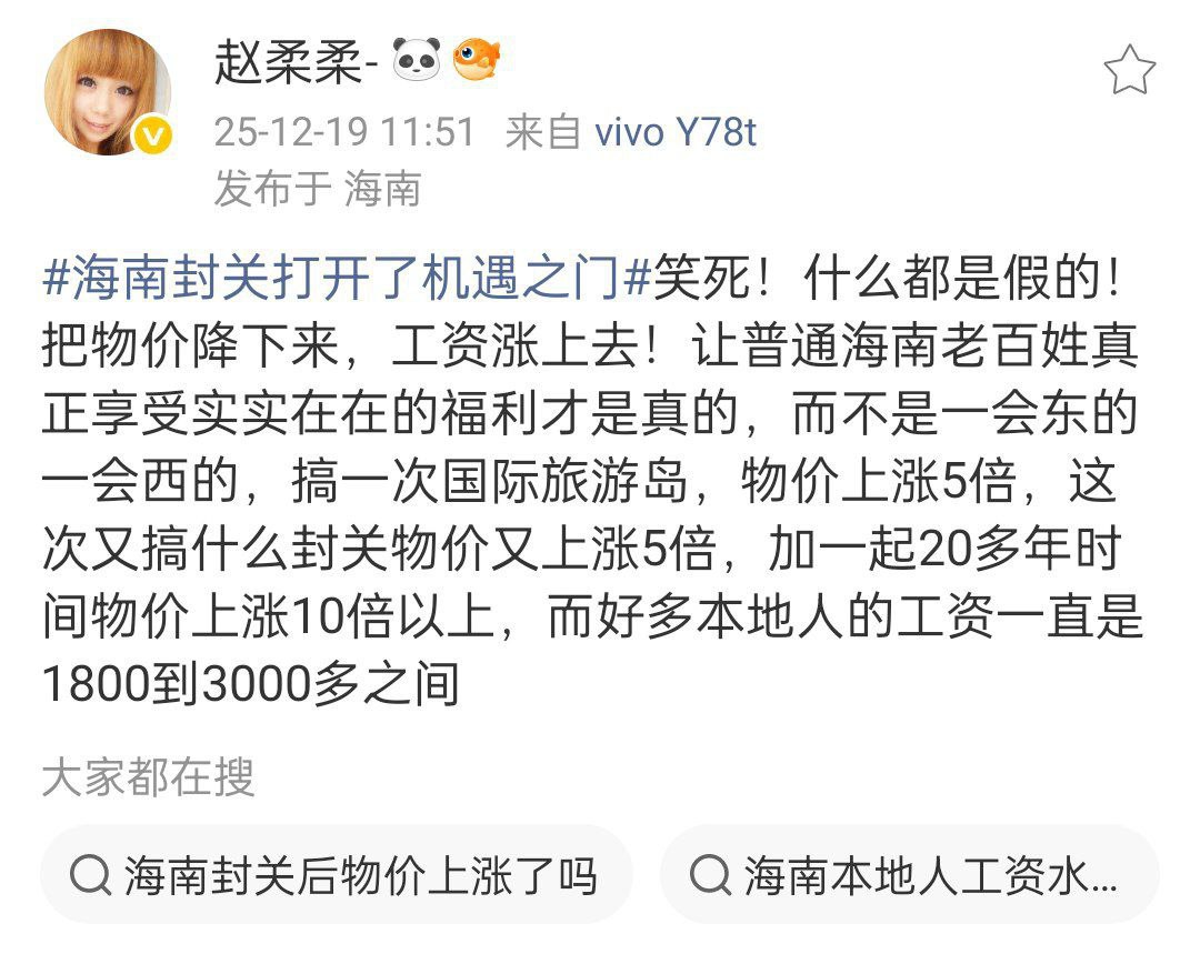 12月18日,歌手赵柔柔在微博帖称,海南封关政策对本地居民没有实惠,物价尤其是蔬菜、肉类、餐饮和外卖大幅上涨,而本地人工资仍仅1800–3000元,生活压力大。该帖随后被删除。12月19日,她再次发帖呼吁降物价、涨工资,让普通海南居民真正受益,并批评政策反复、宣传与实际效果不符。