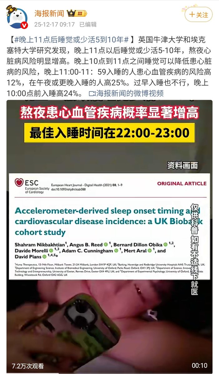 晚上11点后睡觉或少活5到10年?英国牛津大学和埃克塞特大学研究发现,晚上11点以后睡觉或少活5-10年,熬夜心脏病风险明显增高。晚上10点到11点之间睡觉可以降低患心脏病的风险,晚上11:00-11:59入睡的人患心血管疾病的风险高12%,在午夜或更晚入睡的人高25%。