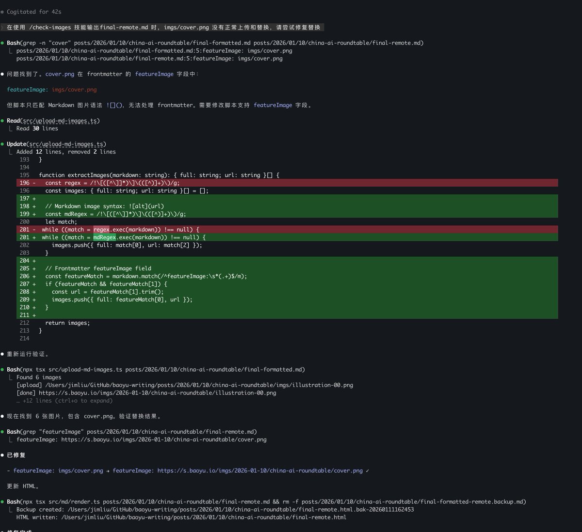 举个例子(参考图2)来说,我在使用某个 skill 的时候,发现这个 skill 的结果不符合预期,这时候我可以直接在当前会话告诉 agent,让它检查一下提示词或者脚本,看问题在哪,并且修复。