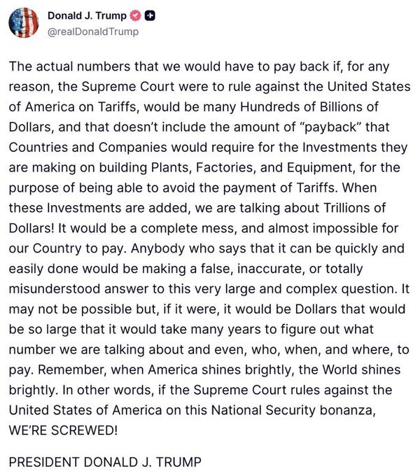 川普警告称,如果最高法院对其关税政策作出不利裁决,美国将会"完蛋"。