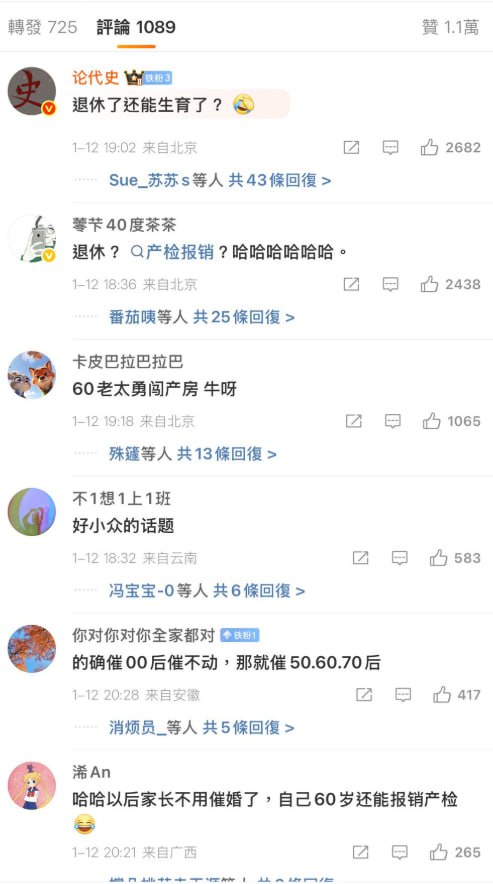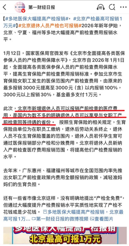 不只有调休,还有“调生”1月12日,第一财经日报发布新闻:2026年年初,多地大幅提高产前检查费用报销水平。其中,北京市新增退休人员可以报销产前检查的医疗费用,是国内为数不多的明确退休人员可以享受与女职工产前检查同等待遇的省份。