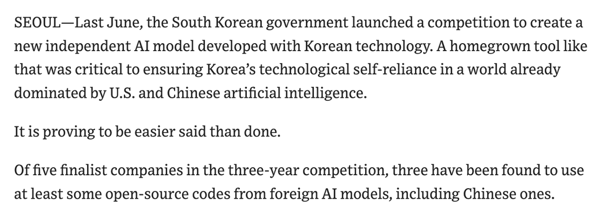 华尔街日报:韩国去年6月发起一场发展本土AI大模型的竞赛以保持技术自主性,但是5家入围决赛的公司中,有3家被发现使用了至少一些来自国外人工智能模型的开源代码,其中包括中国的模型。 近日,入围决赛企业之一的Upstage引发了争议。韩国本土竞争对手Sionic AI称,Upstage模型的部分模块与智谱的开源模型存在相似之处,Upstage的部分代码中甚至还留有智谱的版权标记。 韩国SK电讯也遭到批评,其用于运行模型的推理代码被指与DeepSeek的代码存在相似之处。