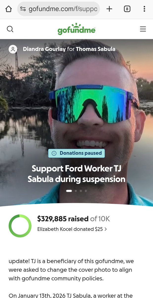 昨天川普访问福特,福特员工TJ Sabula高喊“保护恋童癖”,被川普问候Fuck you并竖中指。随后即被福特解雇的TJ Sabula发起GoFundMe筹款活动,目前有两个相关账号,合计已筹得超过80万美金!!!这是给爱国者的奖励💯💯💯