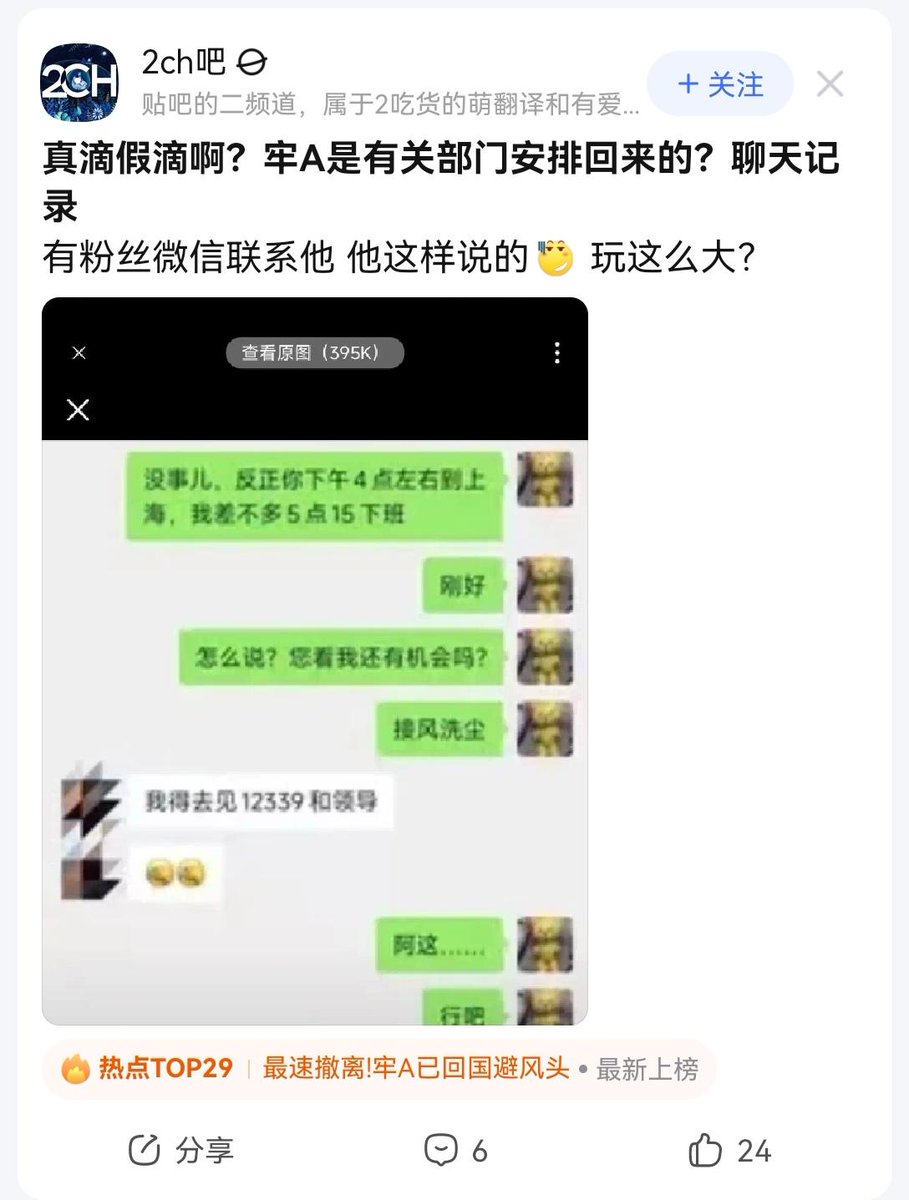此前,有粉丝微信联系牢A要为其接风洗尘,牢A表示,自己回国的行程由国家安排,要去见12339(国安)和“领导”。