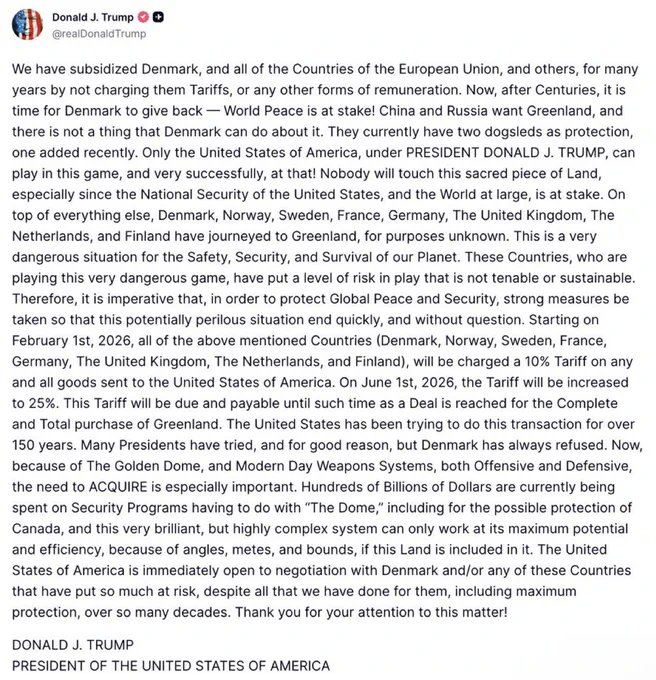 从2026年2月1日开始,上面提到的所有国家(丹麦、挪威、瑞典、法国、德国、英国、荷兰和芬兰)的所有商品,进入美国都要收10%的关税。6月1号,2026年,关税涨到17%。然后涨到25%。这个关税会一直收,直到达成完整彻底购买格陵兰岛的协议为止。美国已经尝试这笔交易150多年了。很多总统都试过,而且有充分理由,但丹麦总是拒绝。