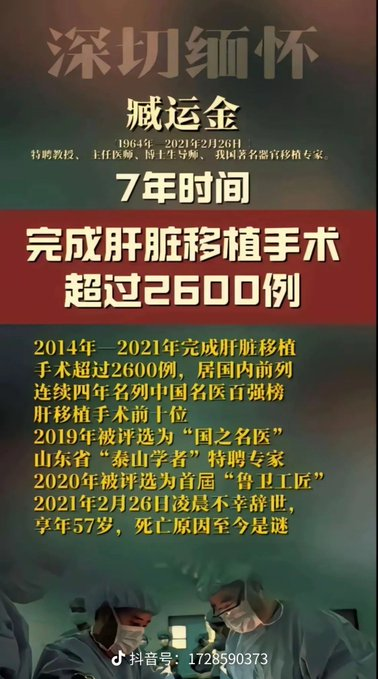 臧运金至今已完成肝脏移植手术超过 2600 例。这意味着,他亲手杀死了2600个年轻人和孩子,并摘取了他们的器官!