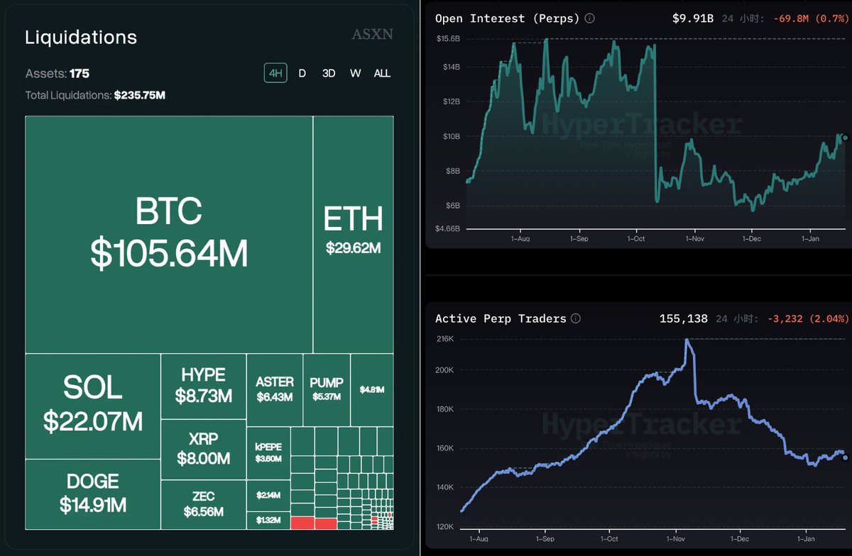 过去 4 小时 Hyperliquid 单平台清算金额高达 2.35 亿美元,其中 $BTC 占比 44.68%(1.05 亿美元),其次为 $ETH 和 $SOL ,主爆多军