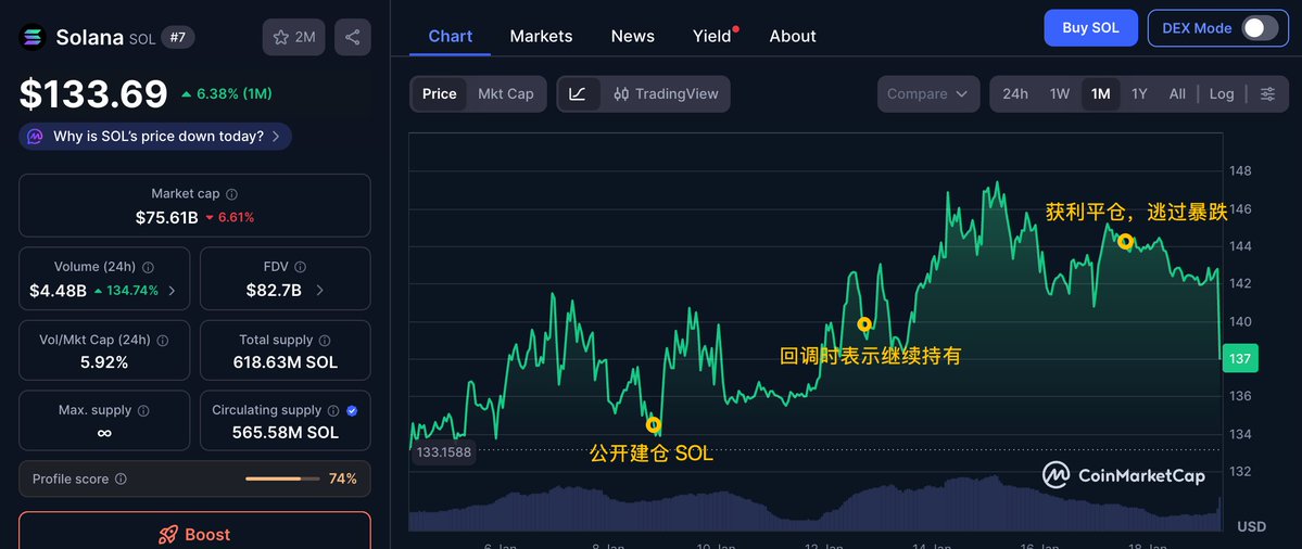 今早大盘暴跌,SOL 回到 01.08 鸽子发文时的成本价 ~$134,利润落袋逃过暴跌,Nice move!