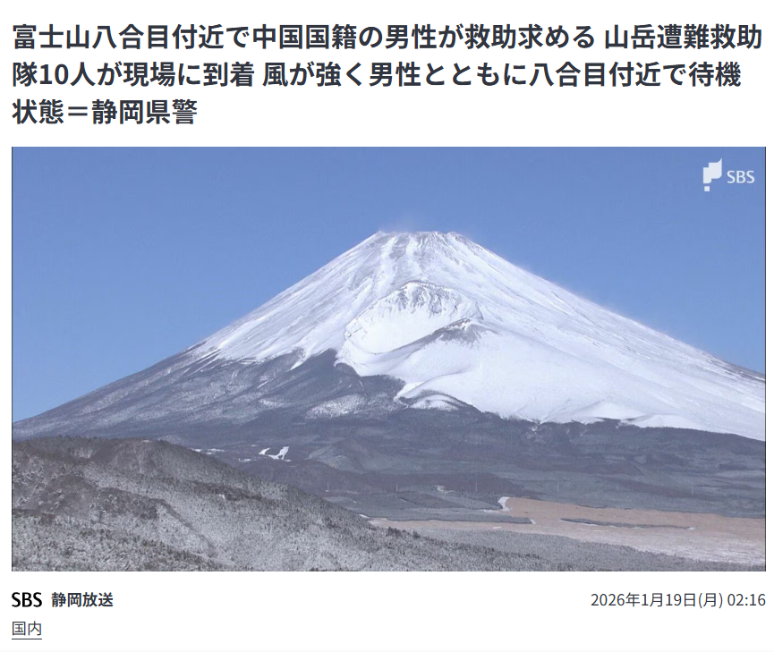 一周前,中國著名的山嶽徒步綫路「鳌太线」發生違規穿越,2死一墜崖。現在,一名中國籍男子在封山季獨自攀登富士山,但在八合目附近受困,隨後撥打救援電話。