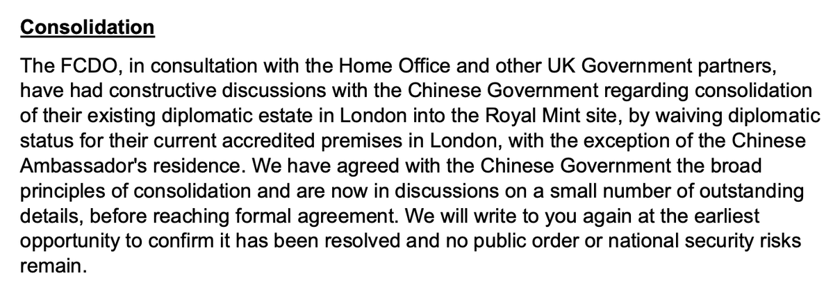 There are many more than 7 consular premises being operated by the Chinese State in London, as the Times reported a month ago. Second, this embassy is designed to accommodate hundreds more Chinese state employees. Is the argument *really* that hundreds more PRC state employees will be unable to interfere in UK life because they are based principally in Royal Mint Court? Hard to take this seriously as a student (and target) for Chinese state activity in the UK. This overlooks the key fact that PRC state influence isn't always - or even predominantly - illegal. But hundreds more state employees absolute WILL mean more influence and interference. Finally, the agreed consolidation can easily be revoked. A Note Verbale is not binding.