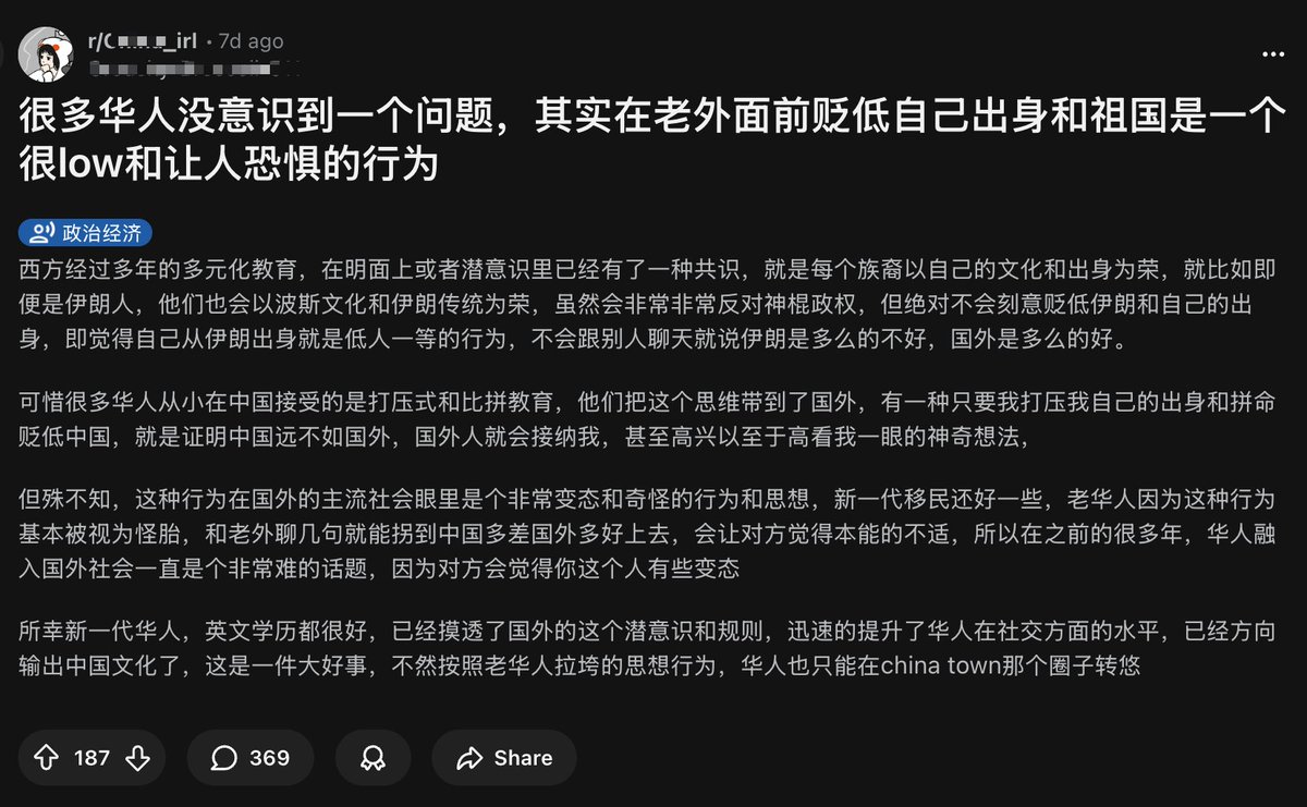 可惜很多华人从小在中国接受的是打压式和比拼教育,他们把这个思维带到了国外,有一种只要我打压我自己的出身和拼命贬低中国,就是证明中国远不如国外,国外人就会接纳我,甚至高兴以至于高看我一眼的神奇想法,