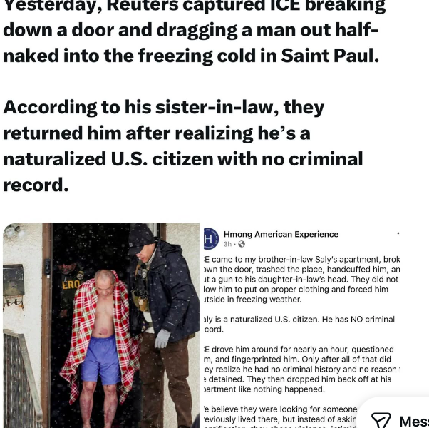 昨天在零下20度的天气几乎半裸被ICE抓走的苗族老人是美国公民,没有任何犯罪记录。