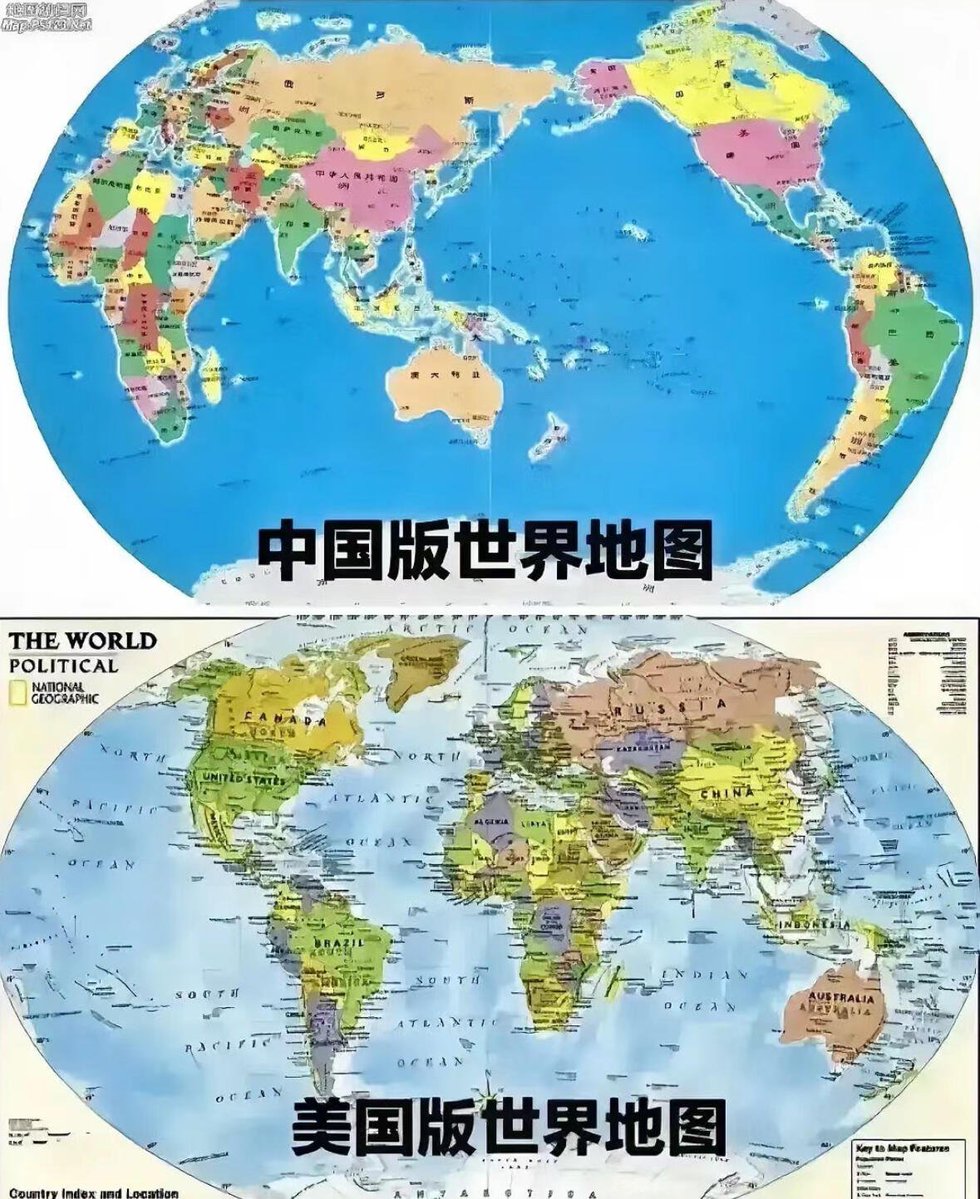 我在美国的图书馆看到下面这张地图,拍照发在同学群,有个同学是高中地理老师,他说下面这张比较合理,因为中间位置是格林威治时间。他说得正确吗?