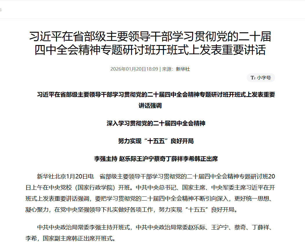 20日上午省部級主要領導幹部學習貫徹黨的二十屆四中全會精神專題研討班在中央黨校(國家行政學院)開班。從2013年1月在中央黨校舉行省部級主要領導幹部學習貫徹黨的十八大精神專題研討班始,這是習近平主政後舉行的省部級學習黨代表大會和中全會精神的第13個研討班。
