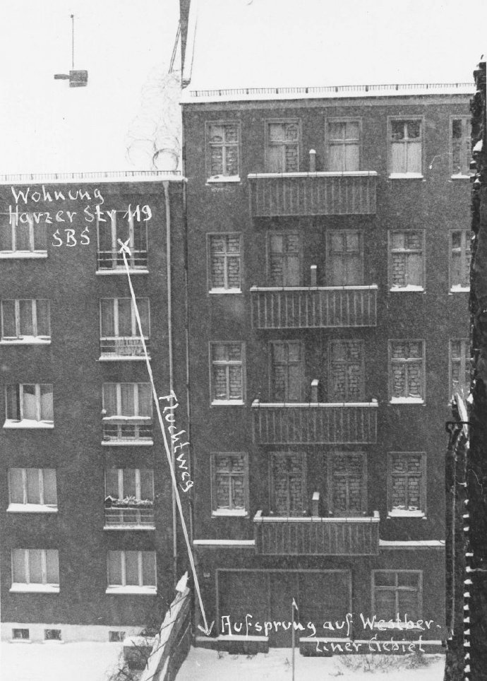 一位名叫迪特尔的马戏团空中飞人就是从东柏林特雷普托区朋友家逃出来的。他用几条晾衣绳制作了一条 50 米长的绳索,从四楼跳下,在墙上荡来荡去,直到到达位于新科隆区的西柏林。 他的壮举导致脚踝骨折。