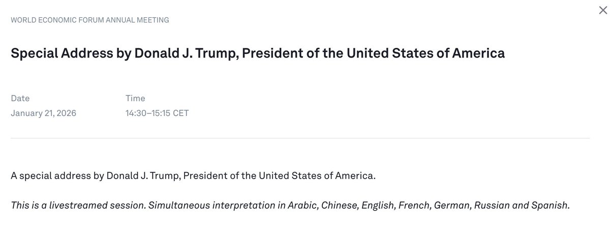 #预告 特朗普将于中欧时间14:30–15:15(北京时间21:30–22:15)在达沃斯世界经济论坛上发表特别讲话。