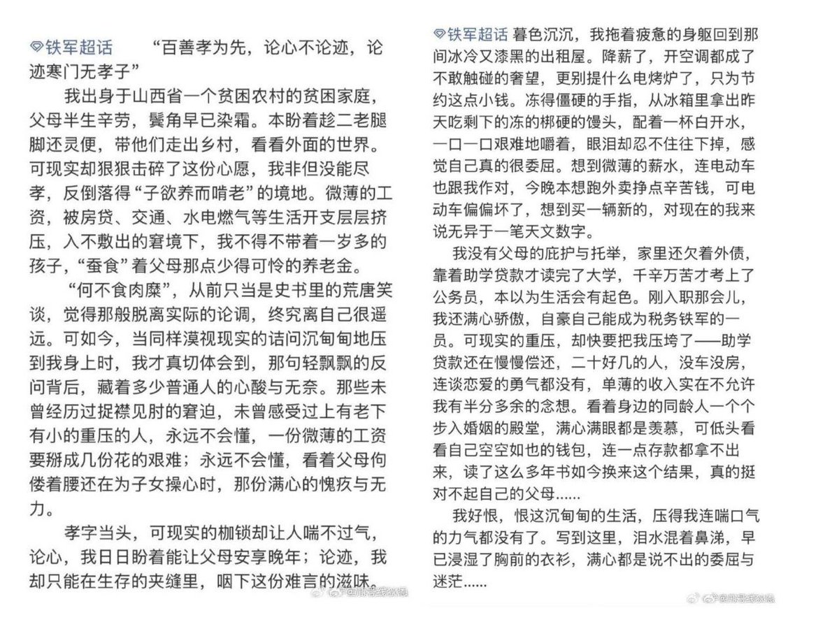 1月19日,不少基层税务职工纷纷发帖,表示自己所在的河南地区几乎没有上升渠道,这是自己千军万马过独木桥才得到的岗位,父母也是出生底层人。降薪后的工资无法负担自己和家人的日常开销,将面临啃老的困境。